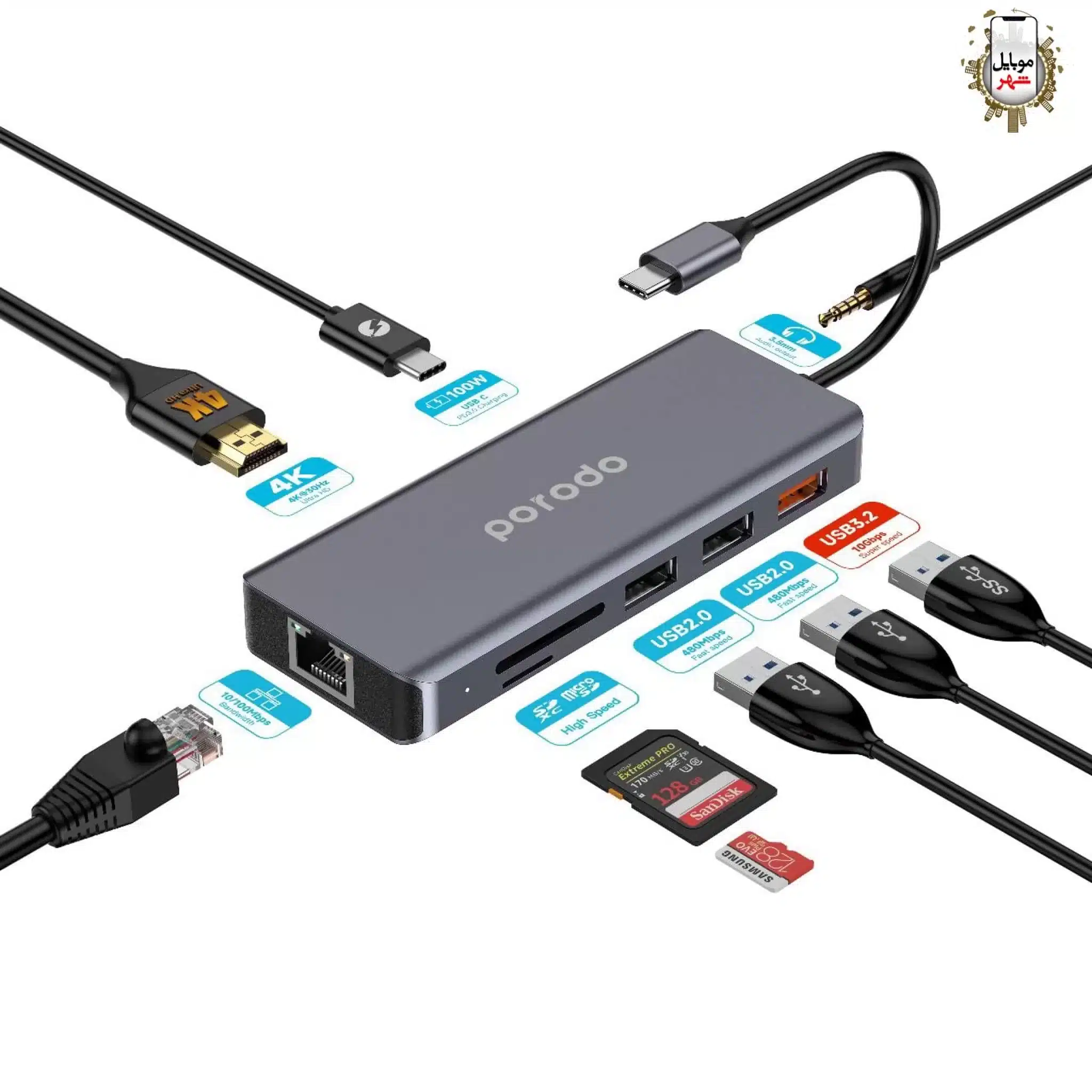 Porodo 9-in-1 4K HDMI With Ethernet USB Hub Type-C